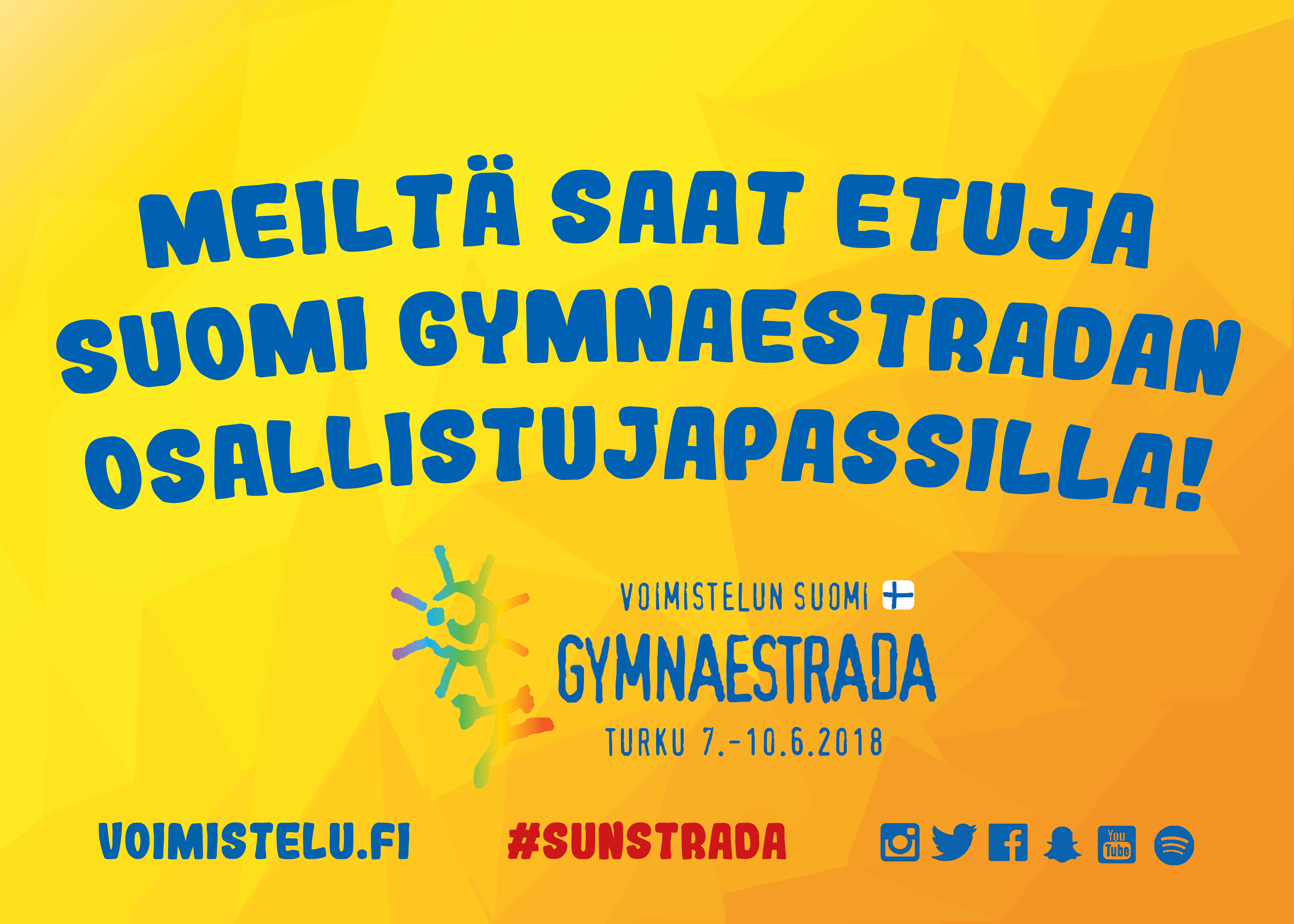 ClickShoes Oy, www.clickshoes.fi With discount code ”gymnaestrada” you will have -10% discount from Turun area’s ClickShoes shops; Hansa, Skanssi, Mylly and ShoeHouseTurku (Kristiinankatu 10). 7.-10.6.2018