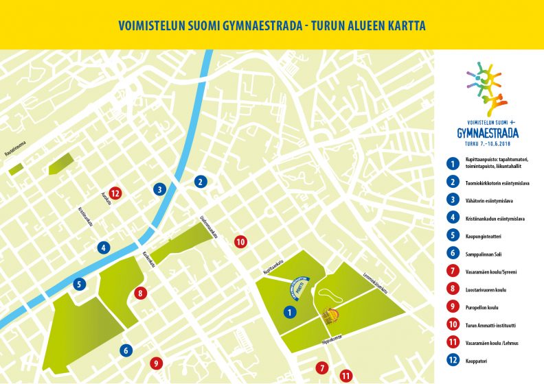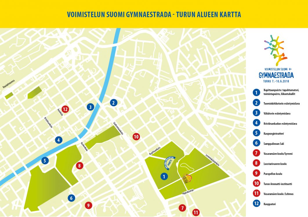 Suomi Gymnaestradan sijoittuu Kupittaanpuistoon. Kilpailuja sekä esityksiä järjestetään Kupittaan alueen urheiluhalleissa mutta voimisteluesityksiä pääsee ihastelemaan myös kaupunkilavoilla Turun keskustassa.